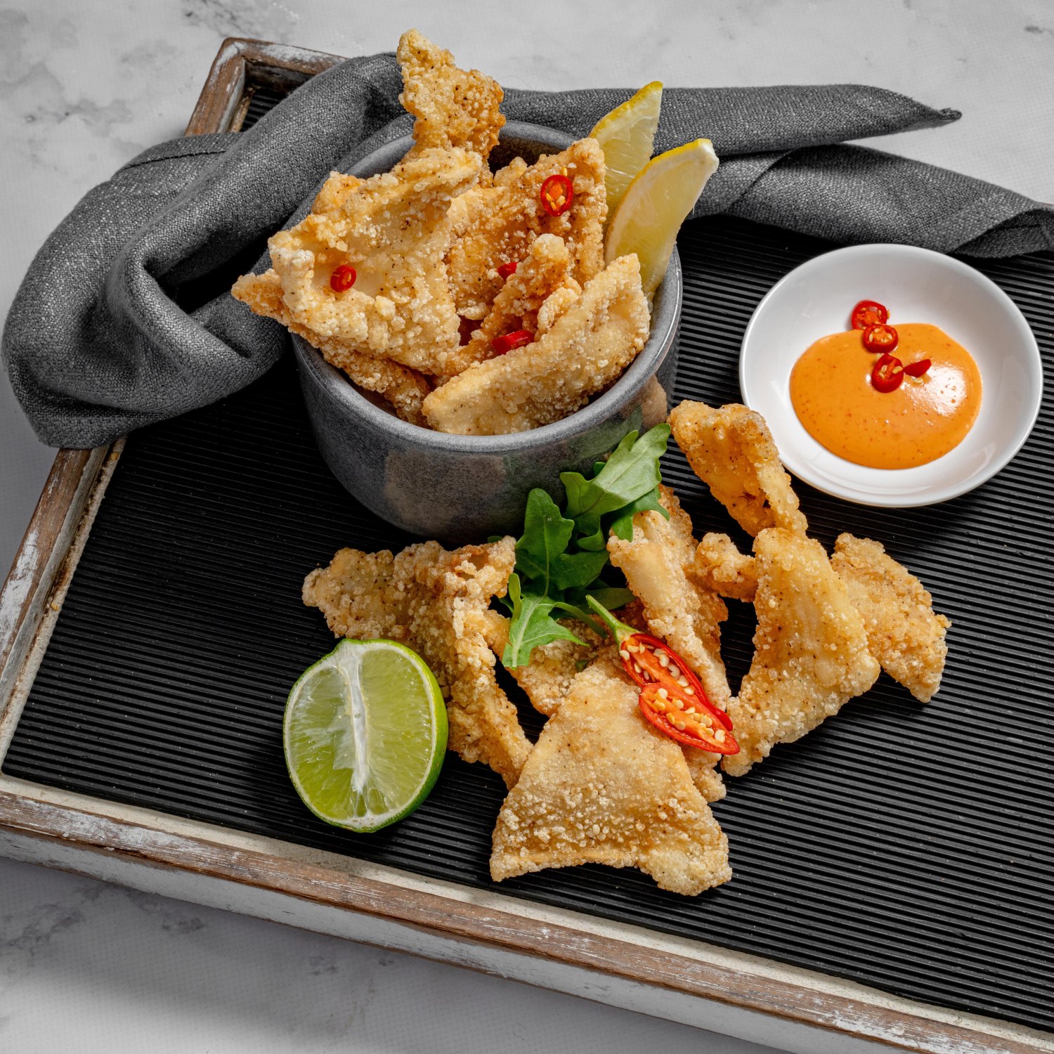 Sea Salt and Pepper Squid, lightly coated and perfectly seasoned with a classic salt and pepper blend, featuring tender and succulent hand-cut squid for a crispy, flavourful bite.